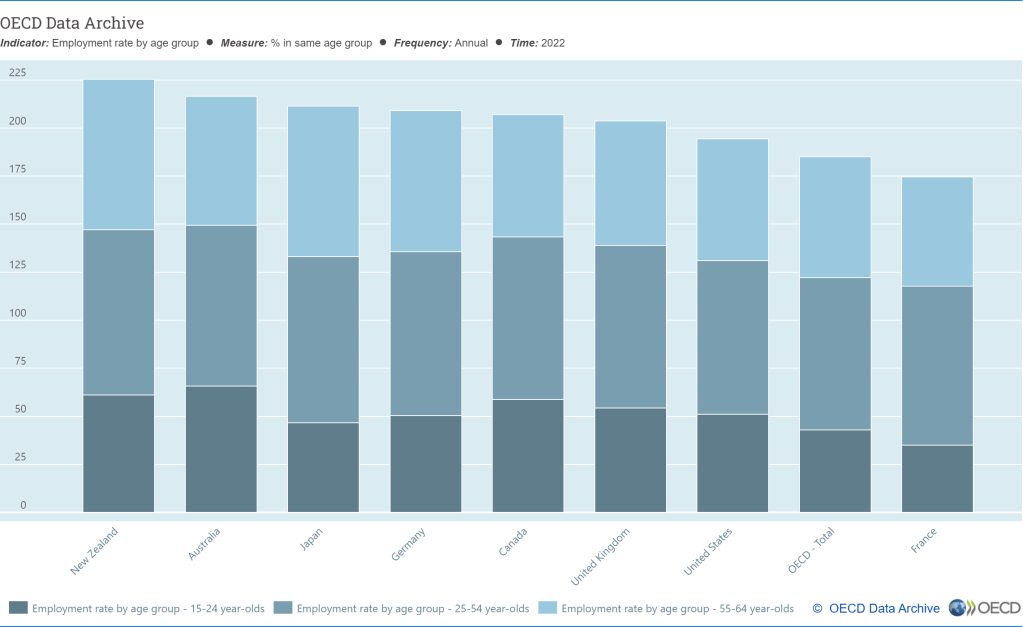 As the impact of a growing PAP is demonstrated in the increase in economic activity through stronger consumption yields from people, mostly by the labour force. This is interesting given that OECD data shows that employment is not concurrent across age groups. Particularly for Japan, as we see there is a lower bottom end and a larger top end compared to most OECD countries.