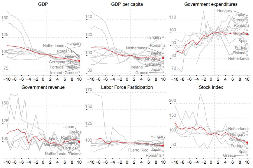 These graphs from the Center for Global Development (CGD) present a varied spread of datasets generally over 80 years. We can assess the productivity of the labour market, as it begins to be impacted by negative prime-age populations. GDP stays high as the proportion of PAP continues to grow, but we can observe a steep decline as negative PAP growth becomes more pronounced for Japan.