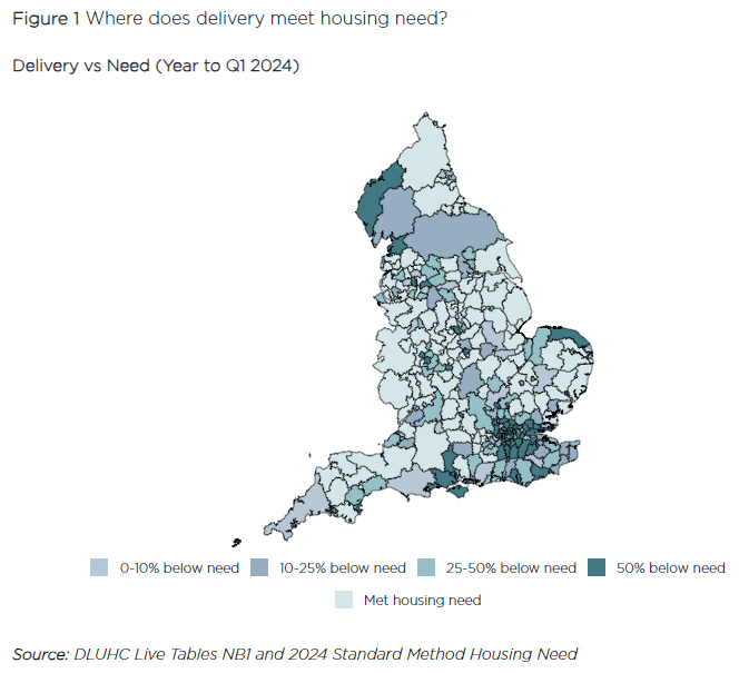 Understanding the housing crisis starts with dispelling a distortion of information. The supply of residential property is a very specific problem focused on urbanised areas, it is not necessarily one affecting every part of Great Britain. Looking at just England, we can see where housing need is met or below required levels. Large clusters form around areas in Greater Manchester, Norfolk, Dorset, West Sussex, East Sussex, Surrey and of course Greater London.